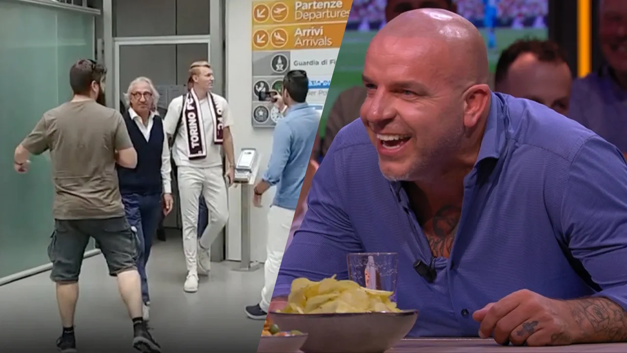 Andy ziet de aankomst van Perr Schuurs op de luchthaven van Turijn en kan z'n lach niet inhouden.