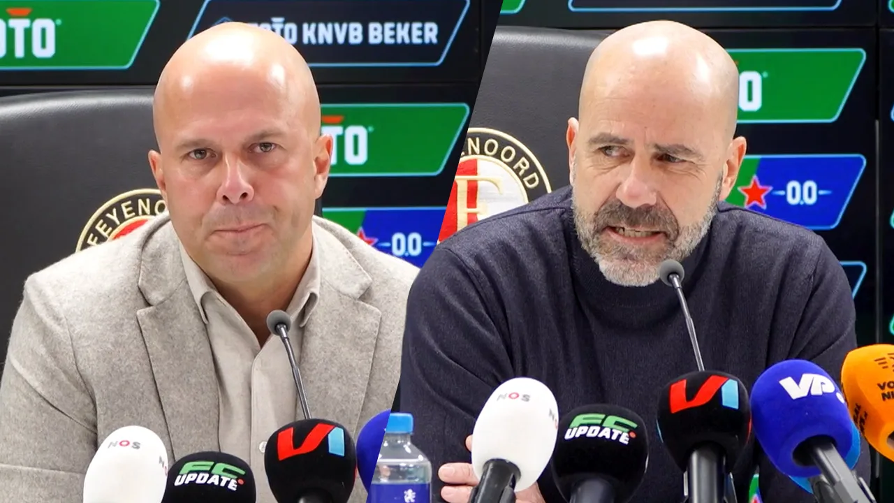 Arne Slot heeft op de persconferentie na de bekerwedstrijd tussen Feyenoord en PSV (1-0) gereageerd op het penaltymoment tijdens de wedstrijd: 'Ik snap heel goed dat Peter daarvoor een strafschop wil hebben.'
