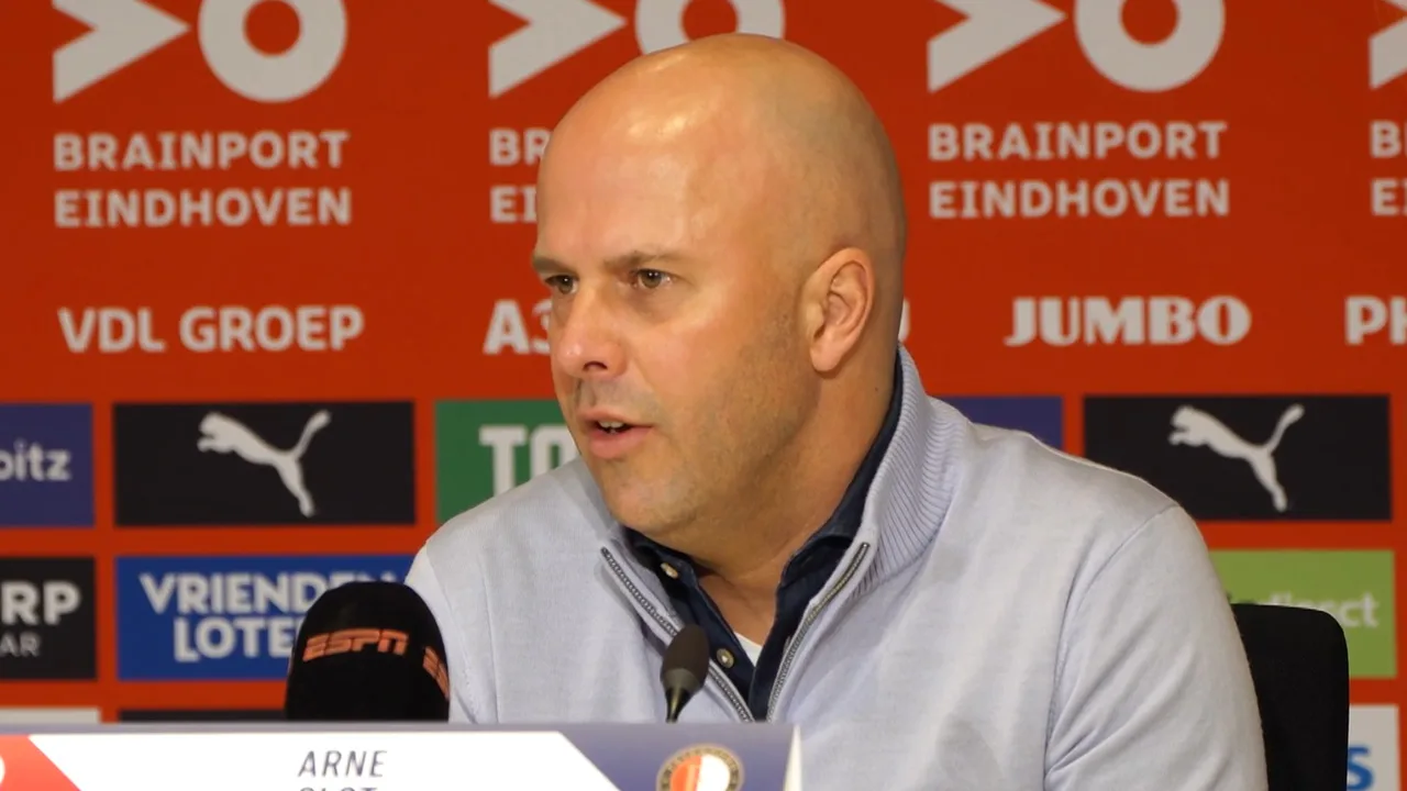 Arne Slot op de persconferentie na afloop van PSV - Feyenoord (2-2).