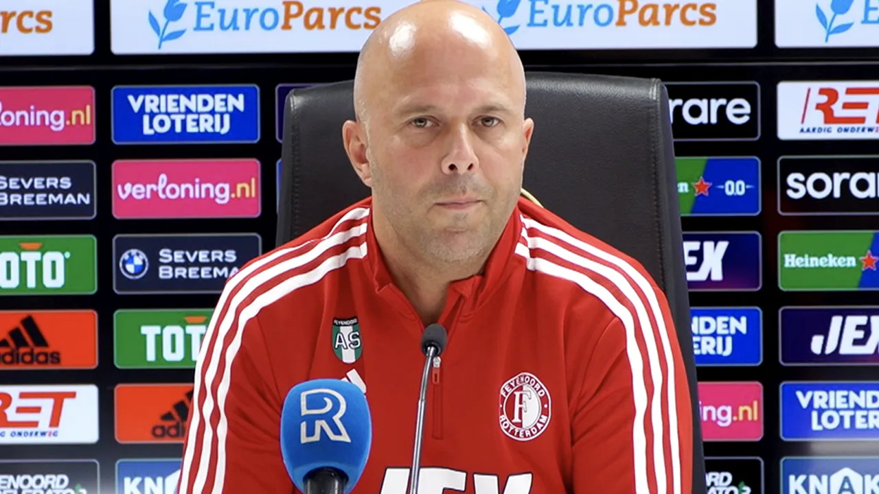 Feyenoord-trainer Arne Slot op de persconferentie in aanloop naar het duel met FC Emmen.