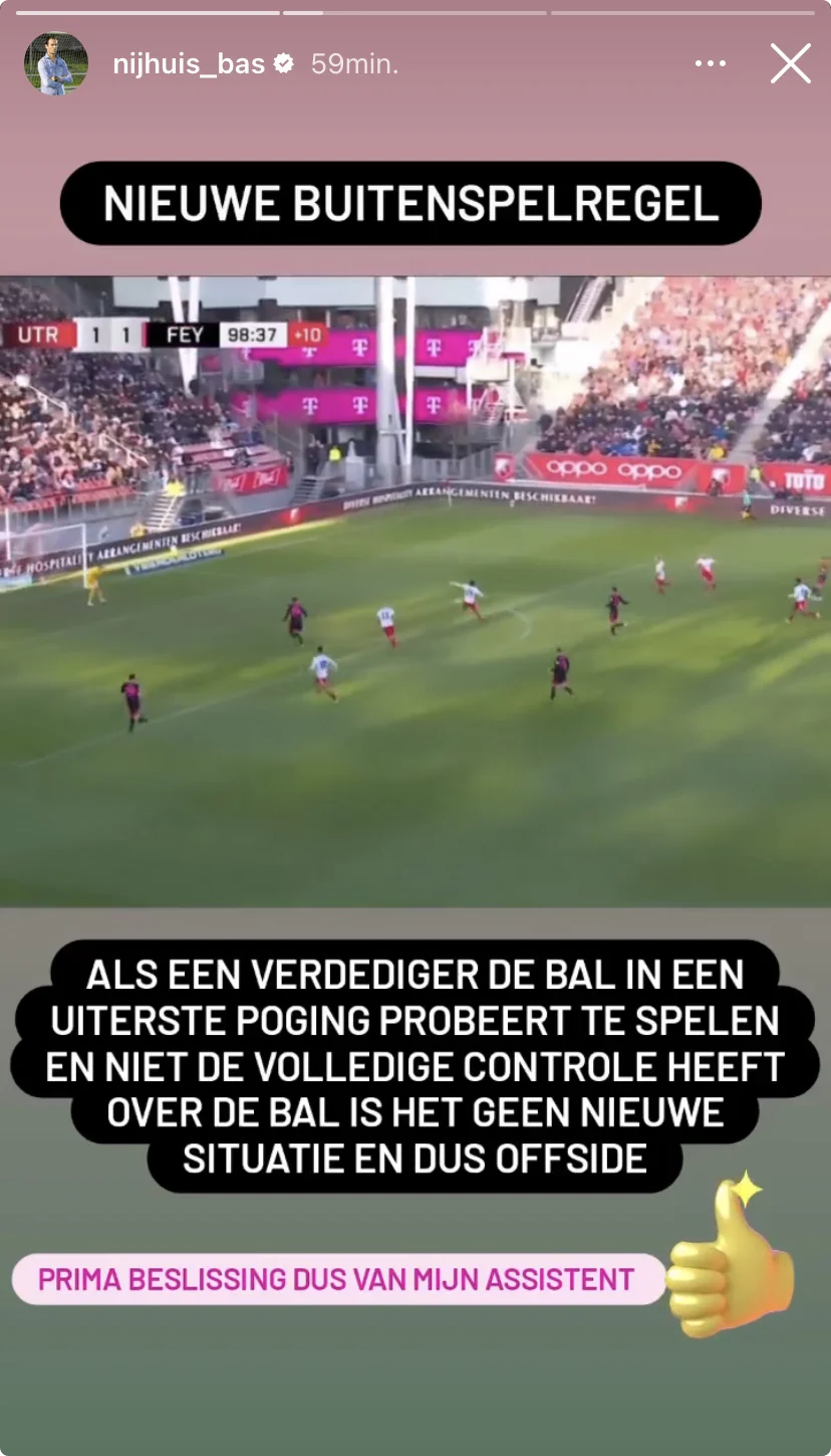 Op Instagram geeft Bas Nijhuis uitleg: "Een nieuwe buitenspelregel: als een verdediger de bal in een uiterste poging probeert te spelen en niet de volledige controle heeft over de bal, is het geen nieuwe situatie, en dus buitenspel. Een prima beslissing dus van mijn assistent."