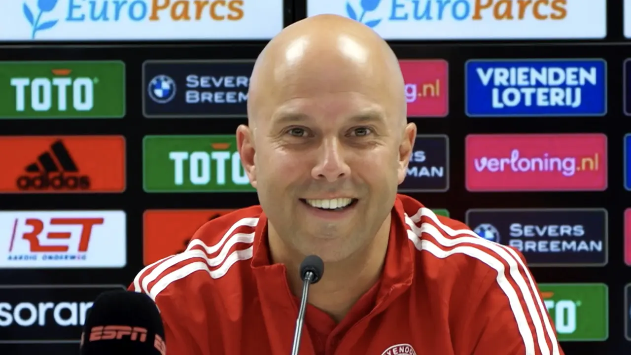 Feyenoord-trainer Arne Slot werpt tijdens de persconferentie na afloop van Feyenoord-Go Ahead Eagles zijn blik op het behaalde kampioenschap.