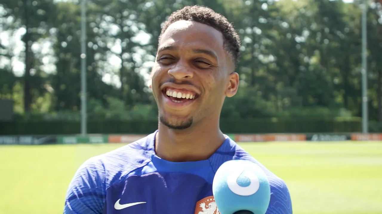 Jurriën Timber met een reactie voor een training op het KNVB Campus in Zeist in aanloop naar de Nations League Finals.