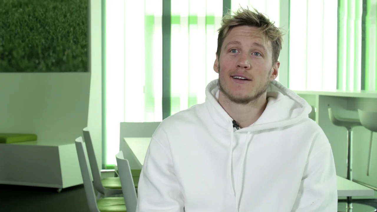 Governor of Poker-Speler van de Maand Wout Weghorst neemt in Wolfsburg de gewonnen bokaal in ontvangst.