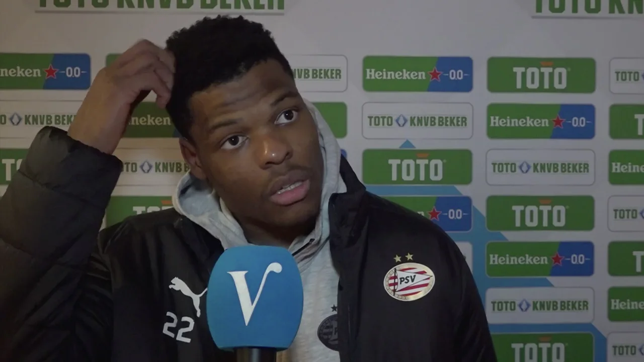 De reactie van PSV-speler Denzel Dumfries na afloop van het gewonnen bekerduel tegen Volendam.