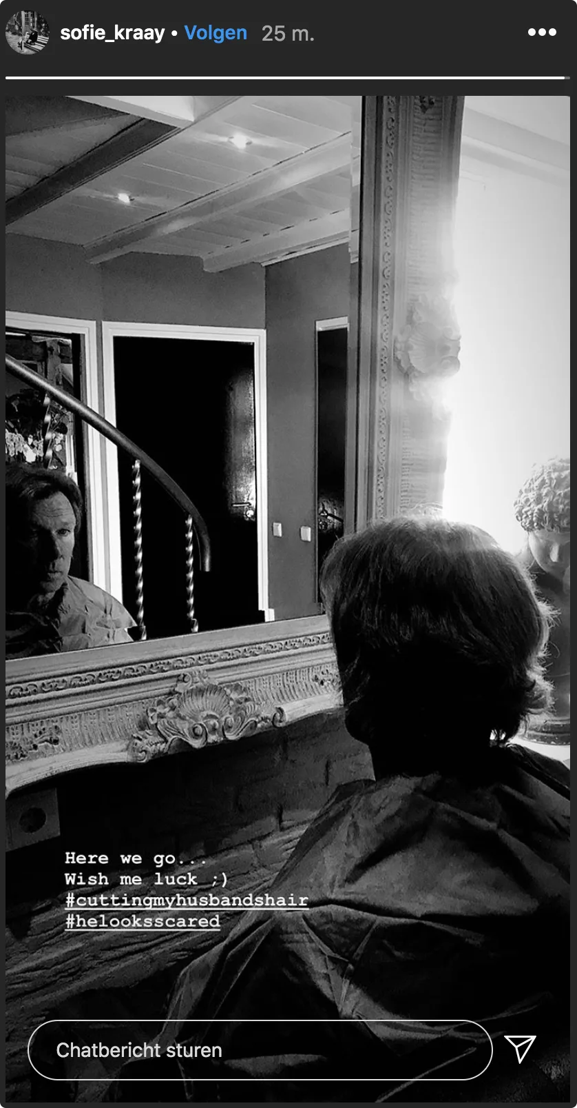 Sophie deelt op Instagram een foto waarop te zien is dat Hans klaarzit voor het laten knippen van zijn haar. Hans kijkt er niet gerust op. Gelukkig kan hij altijd nog terugvallen op het Kees Jansma-model.