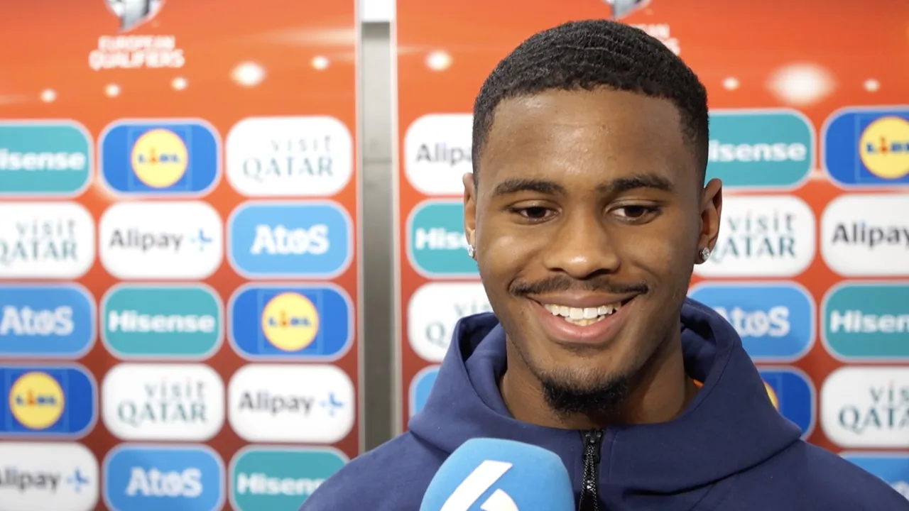 Noa Vahle in gesprek met Jorrel Hato na afloop van het EK-kwalificatieduel tussen Gibraltar en Nederland.