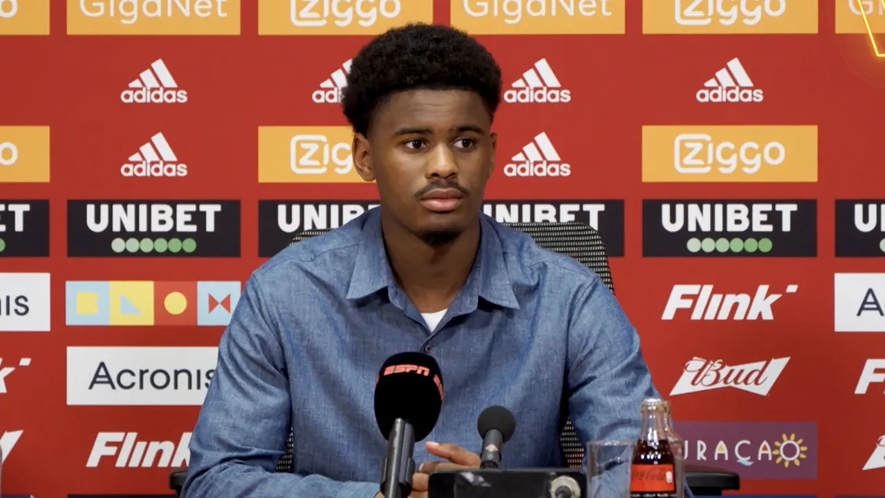 Jorrel Hato op de persconferentie na afloop van Ajax-AZ (0-0).