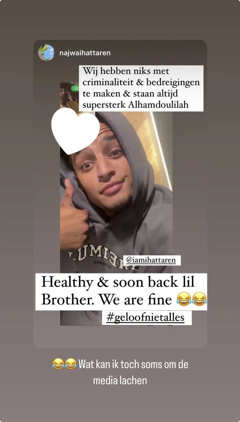 Op Instagram heeft Ihattaren nu van zich laten horen. Hij repost in zijn Stories een bericht waarin bij een foto van hem valt te lezen: "Wij hebben niks met criminaliteit en bedreigingen te maken en staan altijd supersterk. Healthy en soon back lil brother, we are fine. Geloof niet alles," gevolgd door twee lach-emoji's.