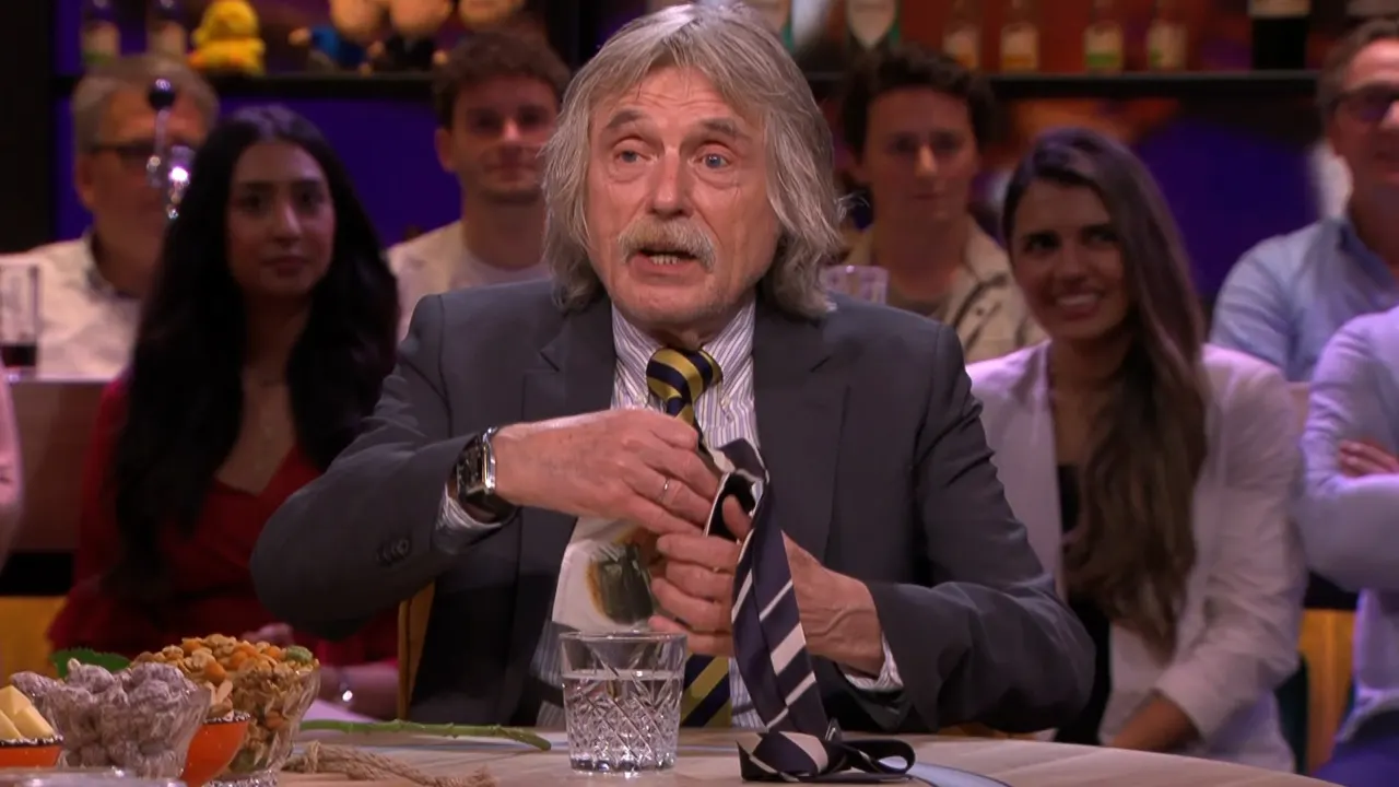 Johan Derksen krijgt uit handen van Bas Nijhuis een hele stoute stropdas die jarenlang van een 85-jarige oma is geweest.
