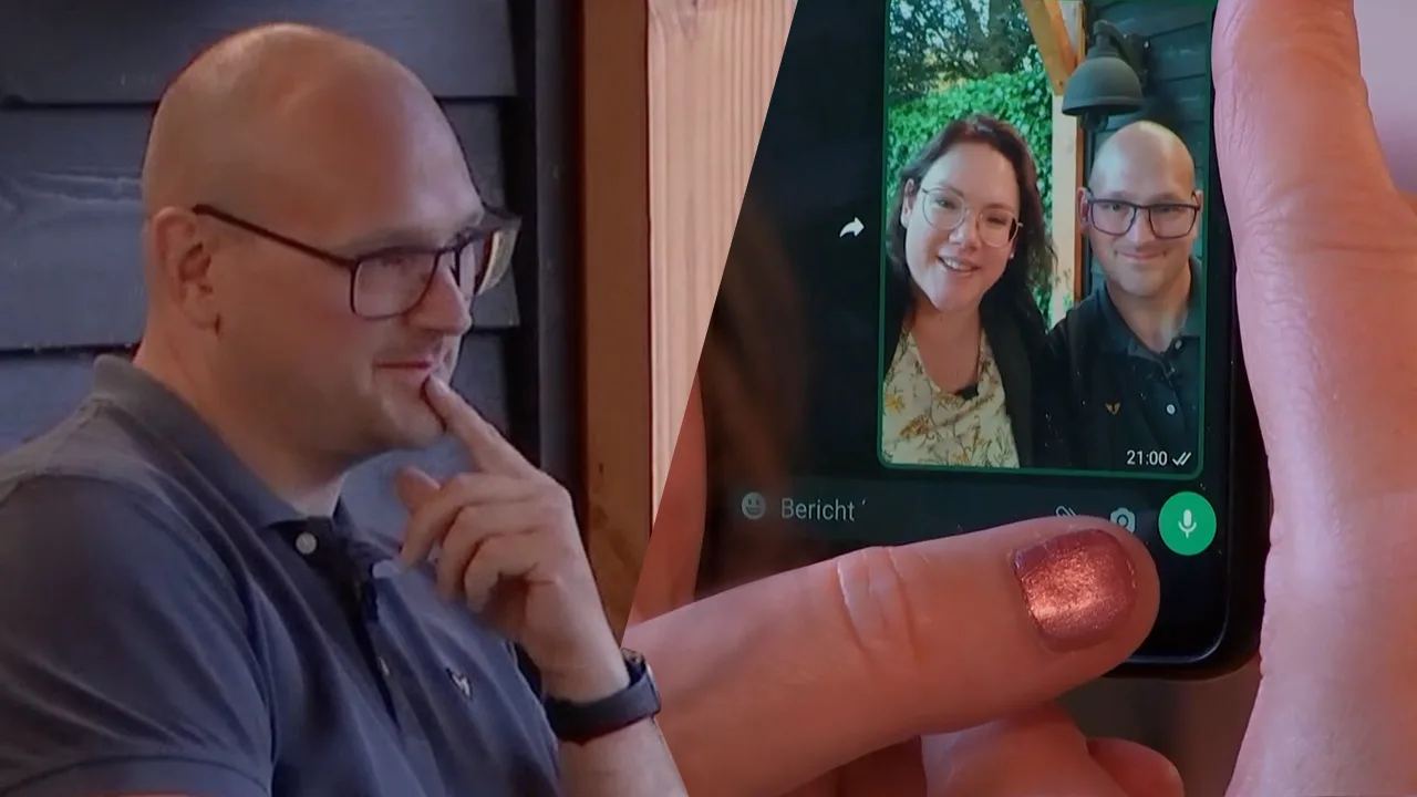Lang Leve de Liefde-deelnemers Yvonne en Laurens maken een selfie in de liefdesvilla, maar laatstgenoemde lijkt niet tevreden met de uitkomst. "Ik lijk wel kaal?!"