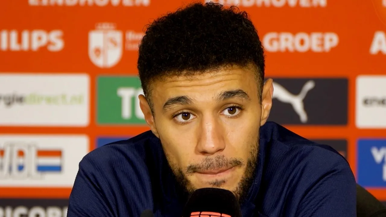Noussair Mazraoui op de persconferentie na afloop van de topper tussen PSV en Ajax (1-2).