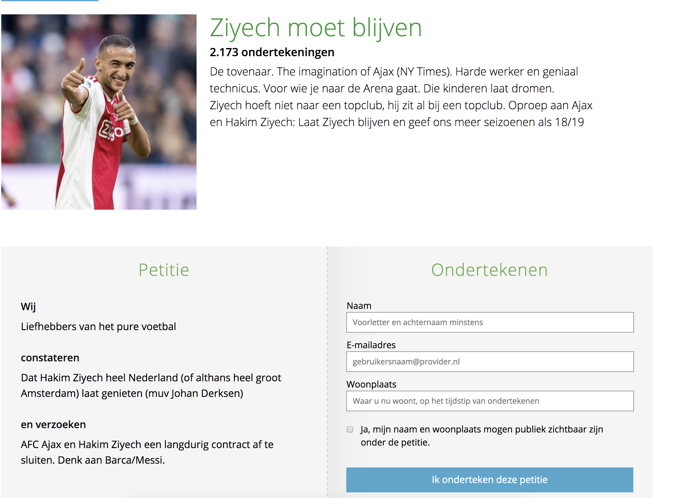 In de petitie sneert de politicus ook naar Johan: 'Wij als liefhebbers van het pure voetbal constateren dat Hakim Ziyech heel Nederland (of althans heel groot Amsterdam) laat genieten (met uitzondering van Johan Derksen).' Het verzoek van de PvdA-leider luidt om Ajax en Ziyech een langdurig contract af te laten sluiten á la Messi en FC Barcelona.