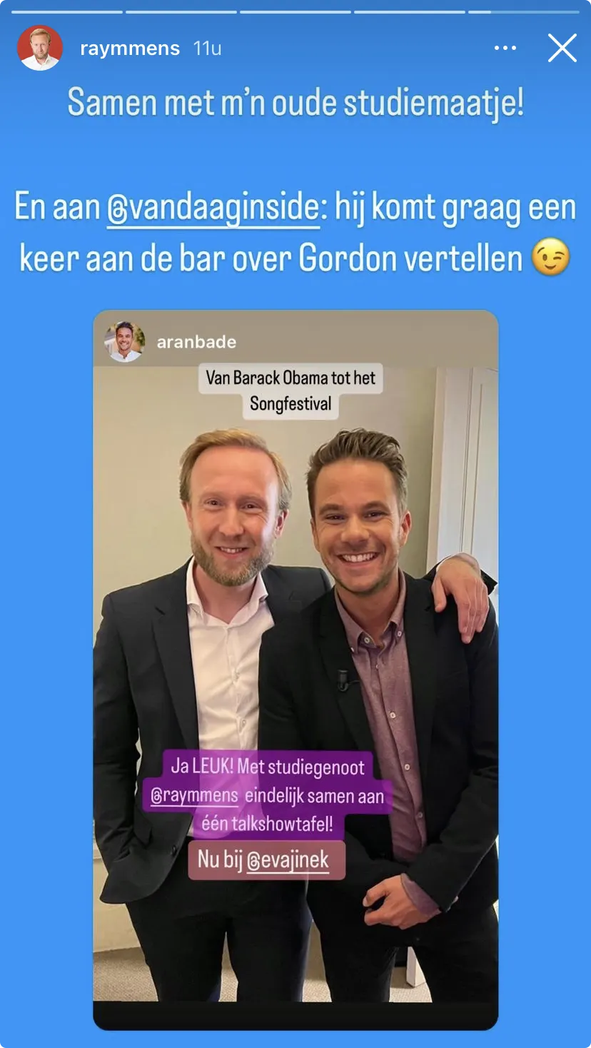 RTL Boulevard-verslaggever Aran Bade komt aan de bar bij Vandaag Inside graag een keer over Gordon vertellen. Dat laat Raymond Mens weten op zijn Instagram stories.