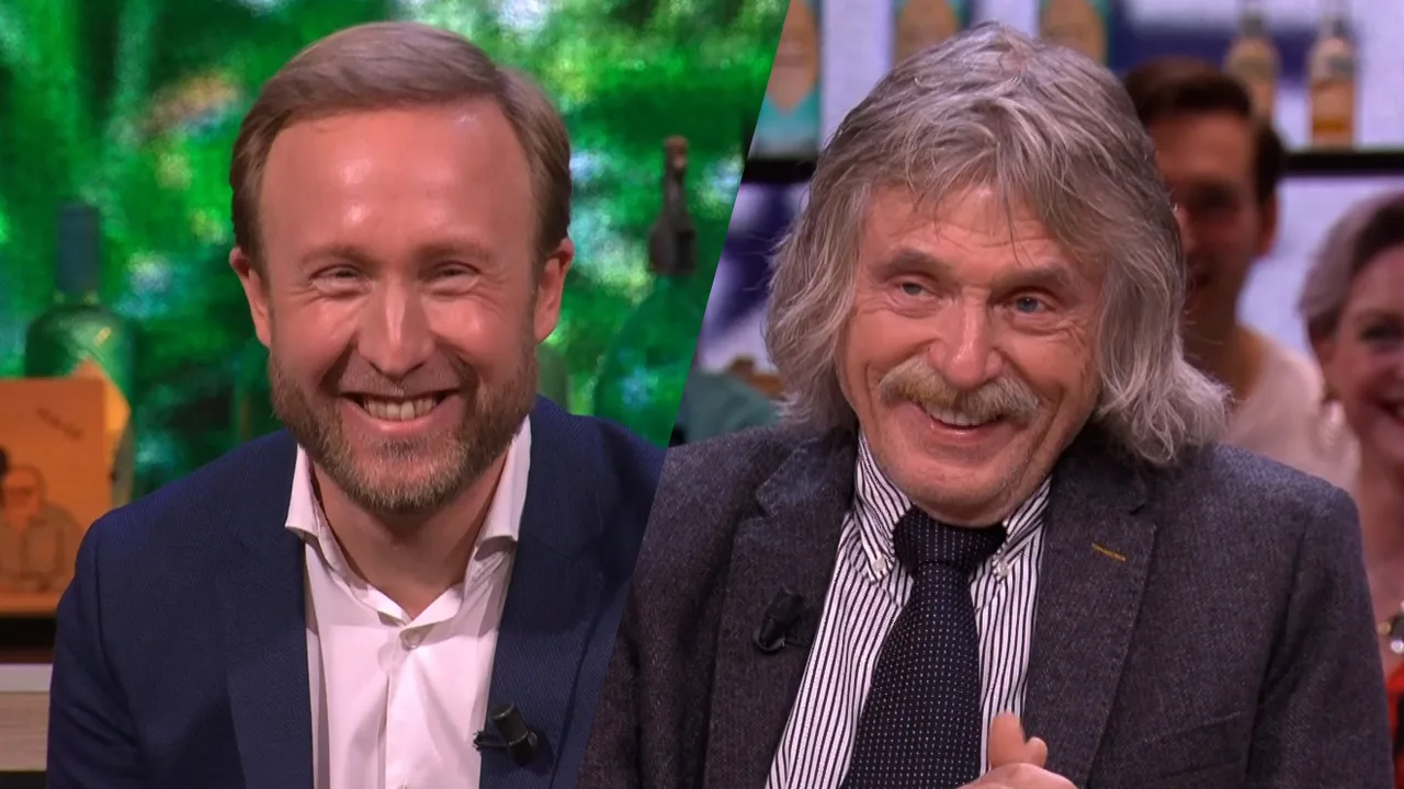 Johan kan zijn lach niet inhouden na een smerig trouwfilmpje, meegenomen door Raymond Mens.