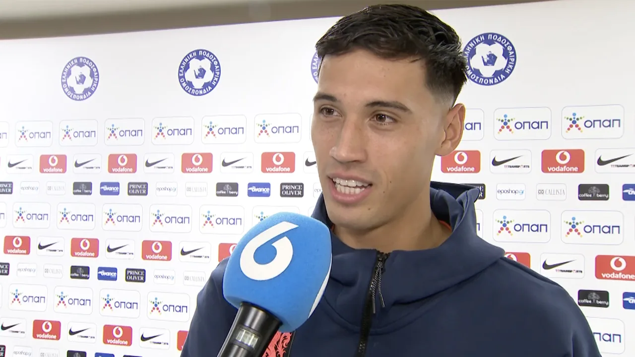 Tijani Reijnders en Nathan Aké in gesprek met Noa Vahle na afloop van Griekenland-Oranje (0-1).