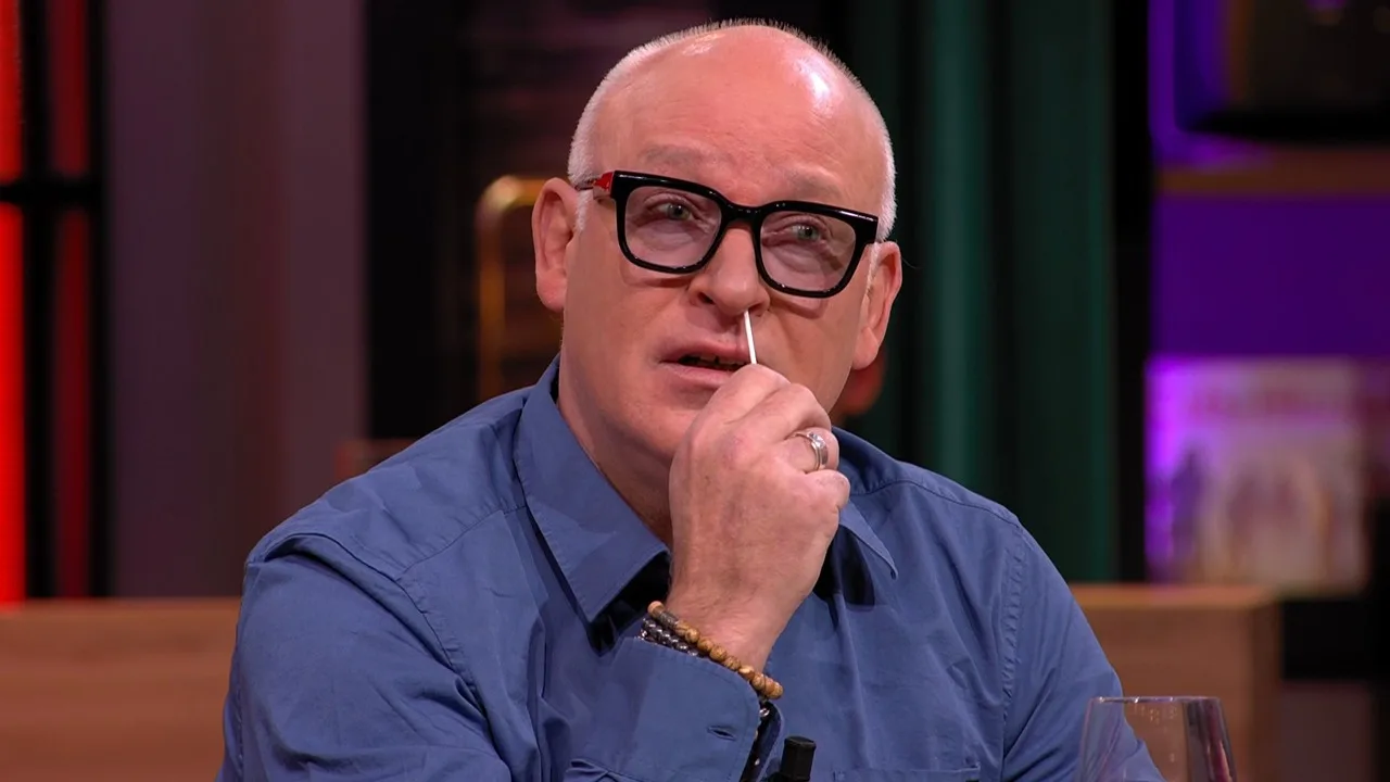 René doet live tijdens de uitzending van VI Vandaag een corona-zelftest.