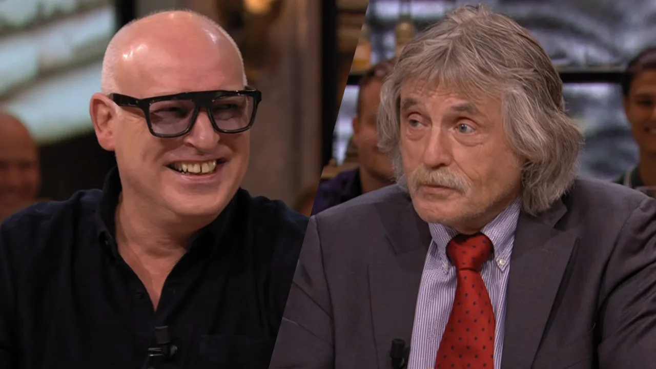 René moet lachen om Johan, die zich nog steeds opwindt over de discussie met Angela de Jong van dinsdagavond.