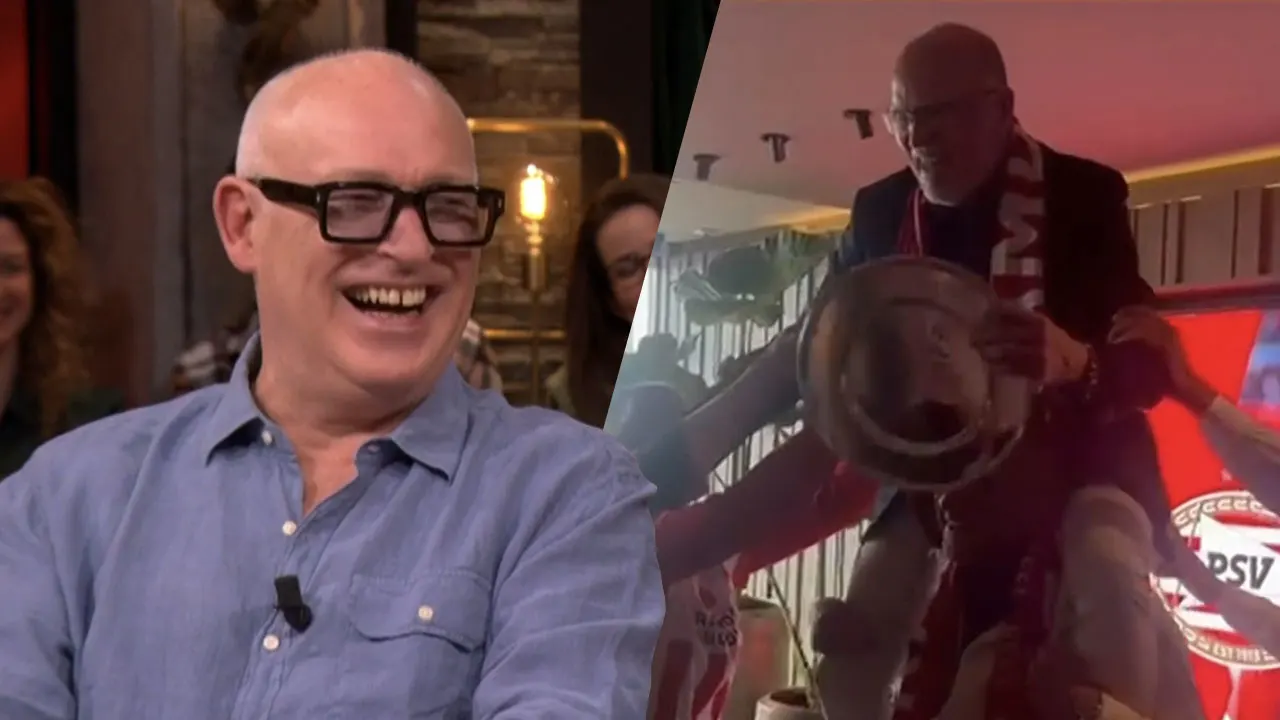 René van der Gijp lacht om beelden van misdaadjournalist John van de Heuvel, die PSV-icoon Willy van de Kerkhof op zijn schouders tilt, nadat PSV het 25ste kampioenschap heeft behaald. Zie video hierboven.