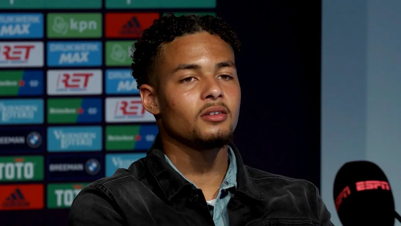 Devyne Rensch op de persconferentie na afloop van Feyenoord-Ajax (0-3).