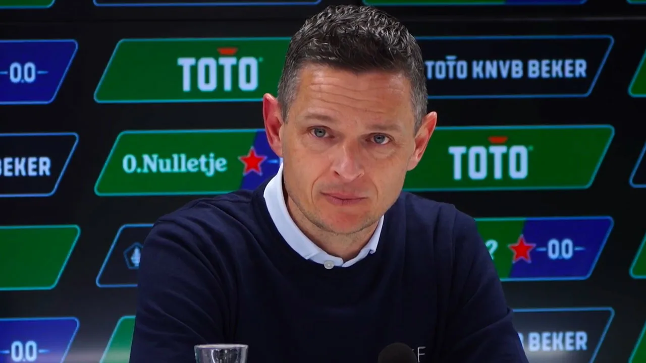 NEC-trainer Rogier Meijer op de persconferentie na afloop van het verlies in de bekerfinale tegen Feyenoord (1-0). Zie video hierboven.