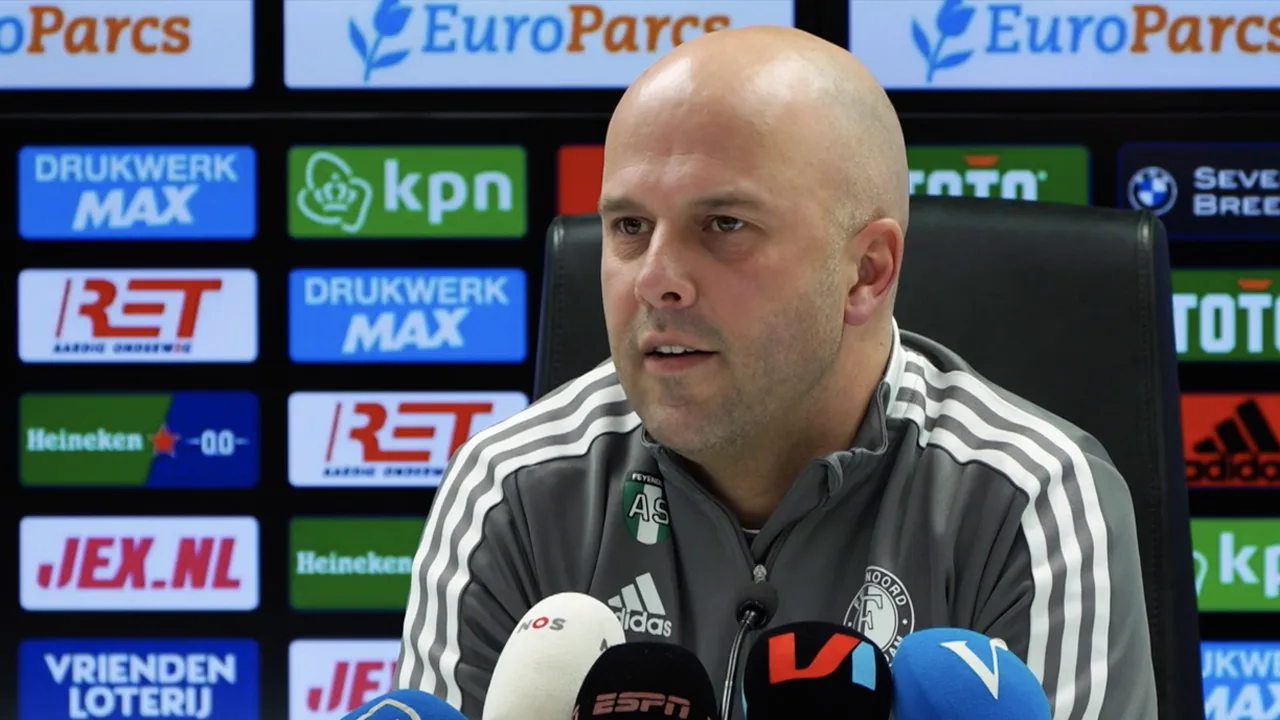 Feyenoord-trainer Arne Slot op de persconferentie in aanloop naar de kraker tussen Feyenoord en Ajax.