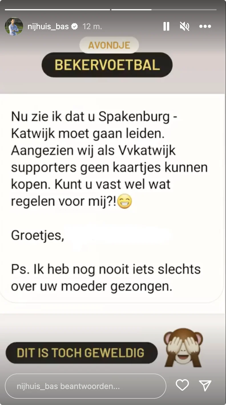 Bas ontving namelijk het volgende bericht van een Katwijk-supporter: "Nu zie ik dat u Spakenburg - Katwijk moet gaan leiden. Aangezien wij als Vvkatwijk supporters geen kaartjes kunnen kopen. Kunt u vast wel wat regelen voor mij?! 😁Groetjes,Ps. Ik heb nog nooit iets slechts over uw moeder gezongen."