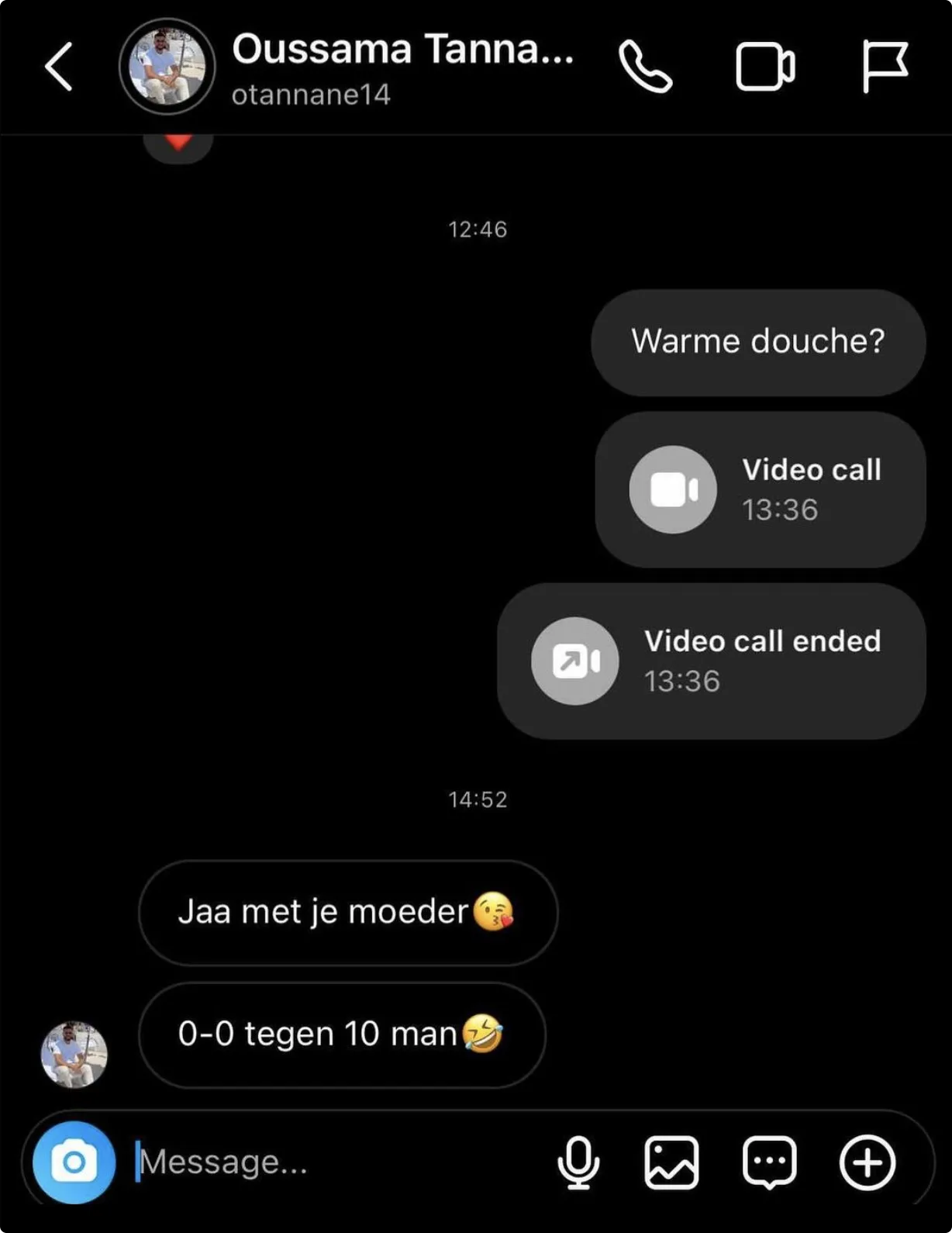 In de Gelderse derby moest NEC'er Oussama Tannane zondag voortijdig het veld verlaten met een rode kaart. Een Vitesse-fan kon het niet laten om de getergde middenvelder een privé-bericht te sturen; waarna Tannane zélf ook reageerde.