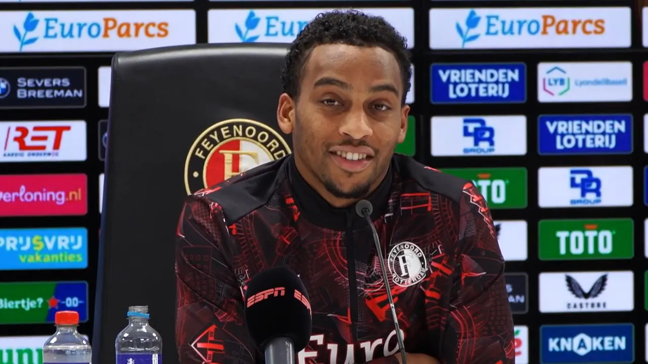 Quinten Timber spreekt op de persconferentie na afloop van Feyenoord – AZ (1-0) over de mentale zorg bij Feyenoord, zijn moeder op de tribune en het foutloze PSV.