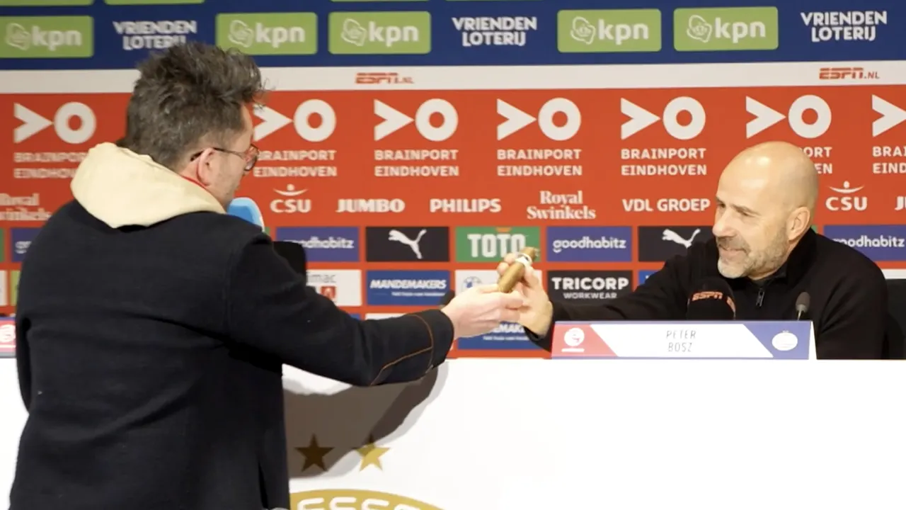 Tom Staal was afgelopen weekend op bezoek in Eindhoven, waar hij de sfeer polste rondom het duel tussen PSV en Feyenoord én een dikke sigaar overhandigde aan Peter Bosz.