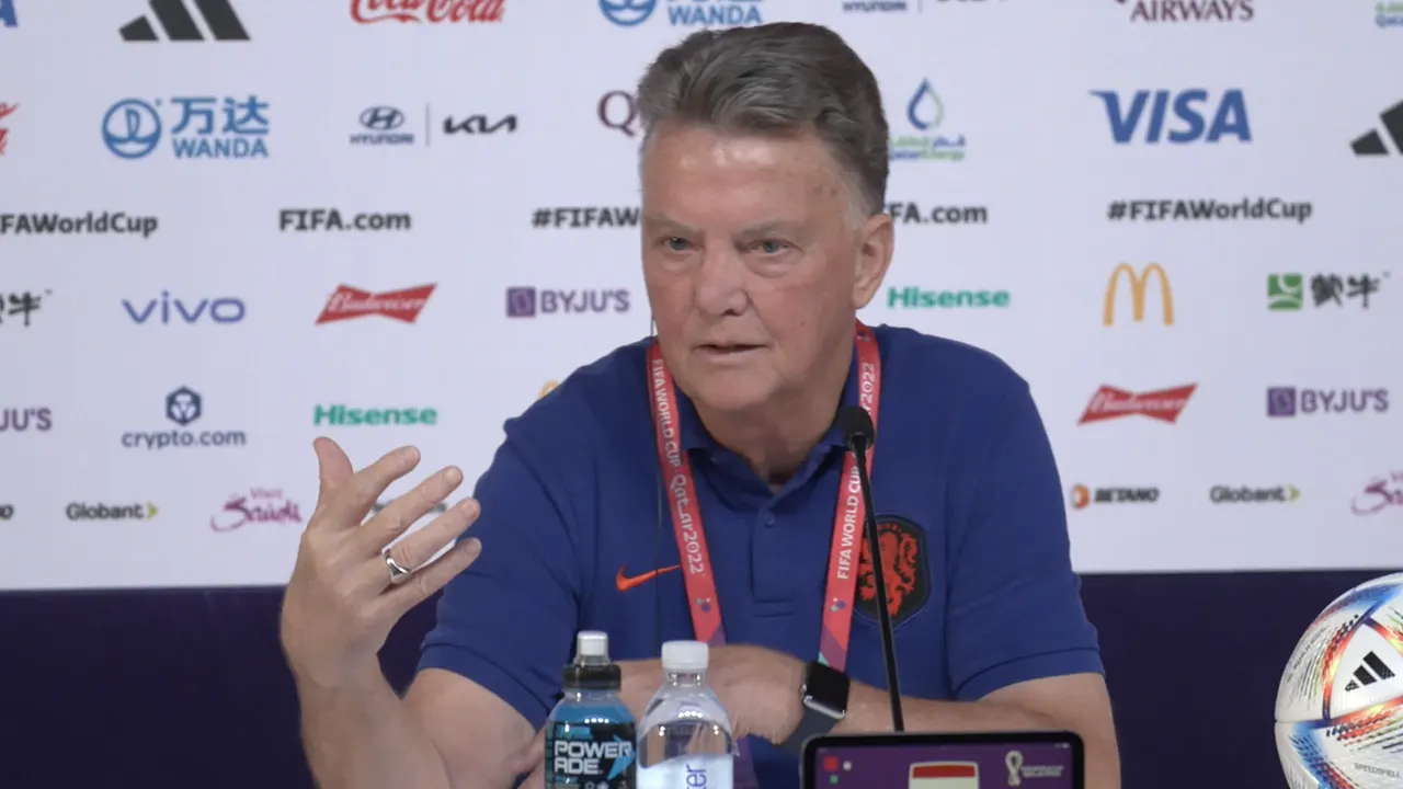Bondscoach Louis van Gaal en Memphis Depay op de persconferentie richting de kwartfinale tussen Oranje en Argentinië.