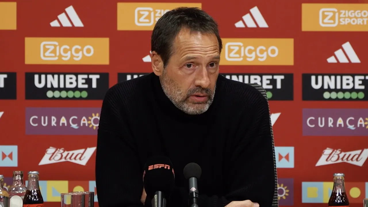 Trainer John van 't Schip op de persconferentie na afloop van Ajax - Go Ahead Eagles (1-1). Zie video hierboven.