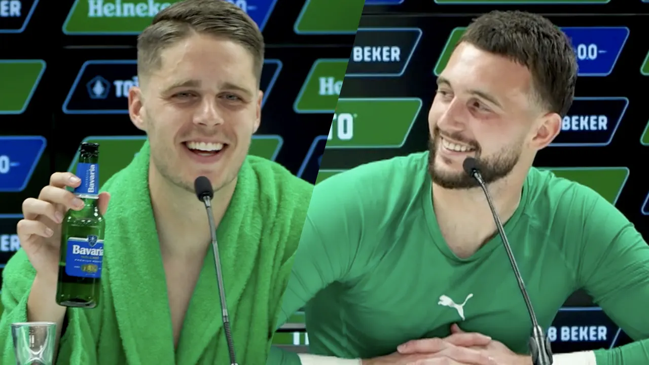 Joey Veerman en Joël Drommel met hun reactie na afloop van de bekerfinale tussen Ajax en PSV.