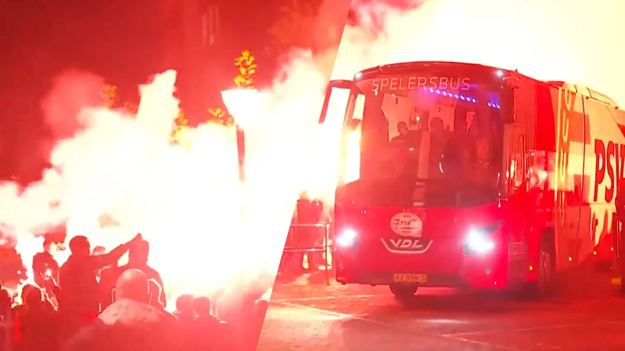 Video: Dolblije supporters onthalen PSV-selectie met fakkels en vuurwerk