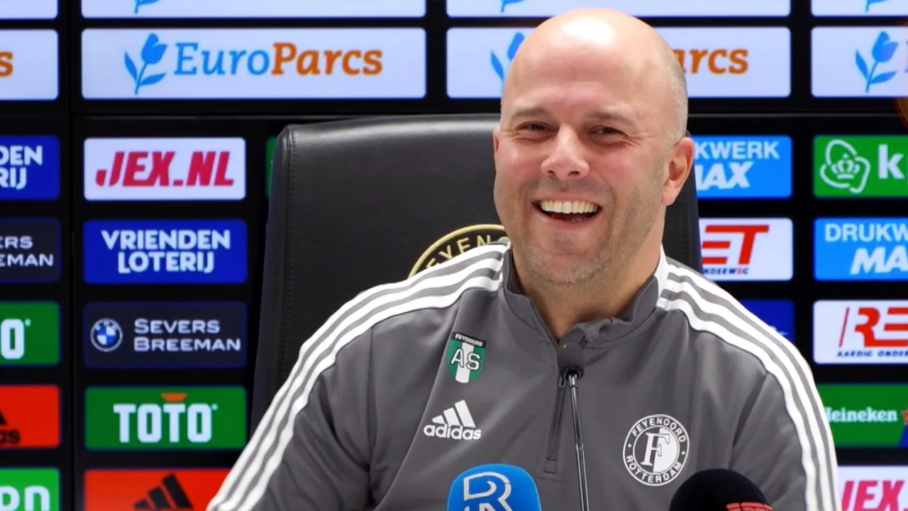 Feyenoord-trainer Arne Slot op de persconferentie in aanloop naar het eredivisieduel met Vitesse.