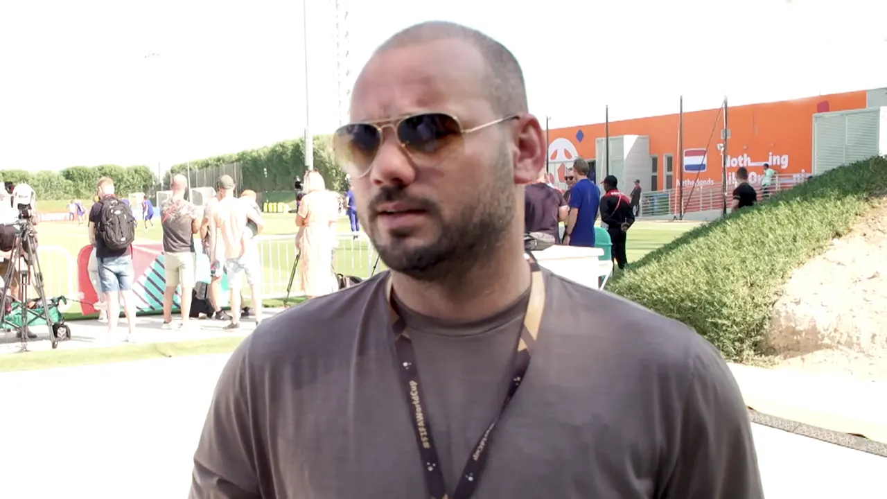 Wesley Sneijder in gesprek met Noa Vahle bij de training van het Nederlands elftal.