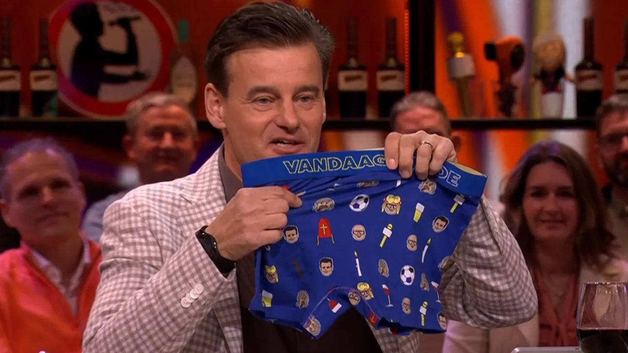 Wilfred bewondert het unieke design van de nieuwe Vandaag Inside-onderbroek. Nu te pre-orderen op vandaaginside.shop