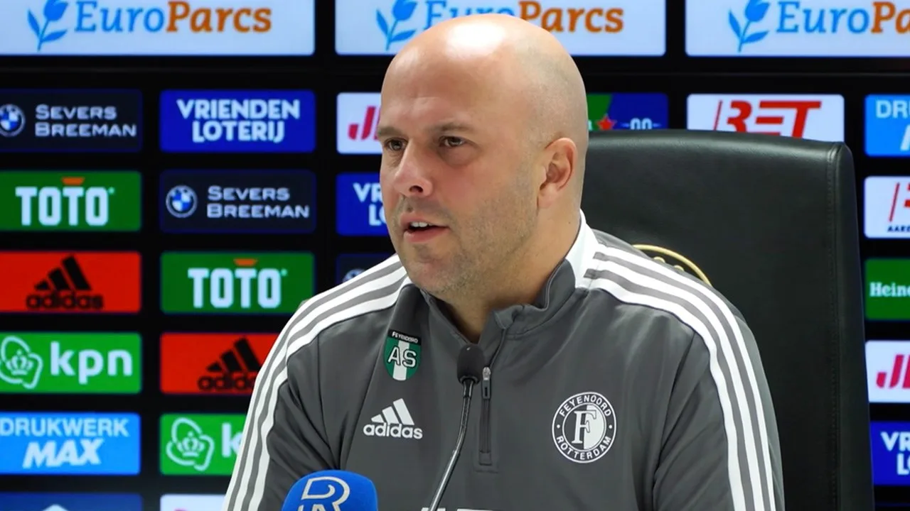 Feyenoord-trainer Arne Slot op de persconferentie in aanloop naar het duel met Fortuna Sittard.