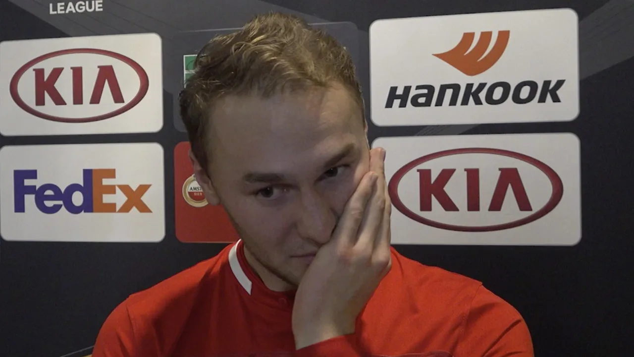 Verslaggever Marlon Braakman in gesprek met AZ-aanvoerder Teun Koopmeiners.