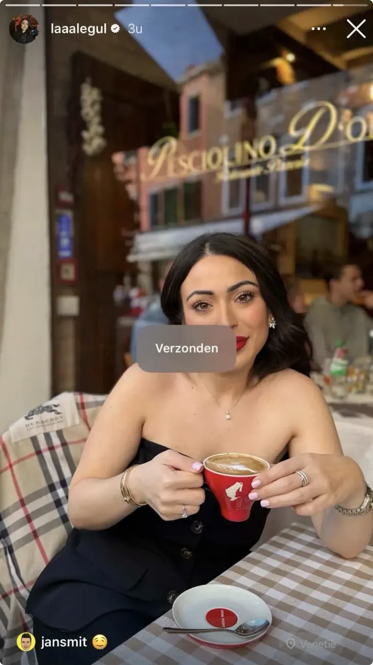 Lale Gül plaatste in haar Instagram Stories een foto waarop ze in Venetië geniet van een kopje koffie. Juicekanaal RealityFBI viel op dat Jan Smit, bedoeld of onbedoeld, een openbare reactie plaatste.
