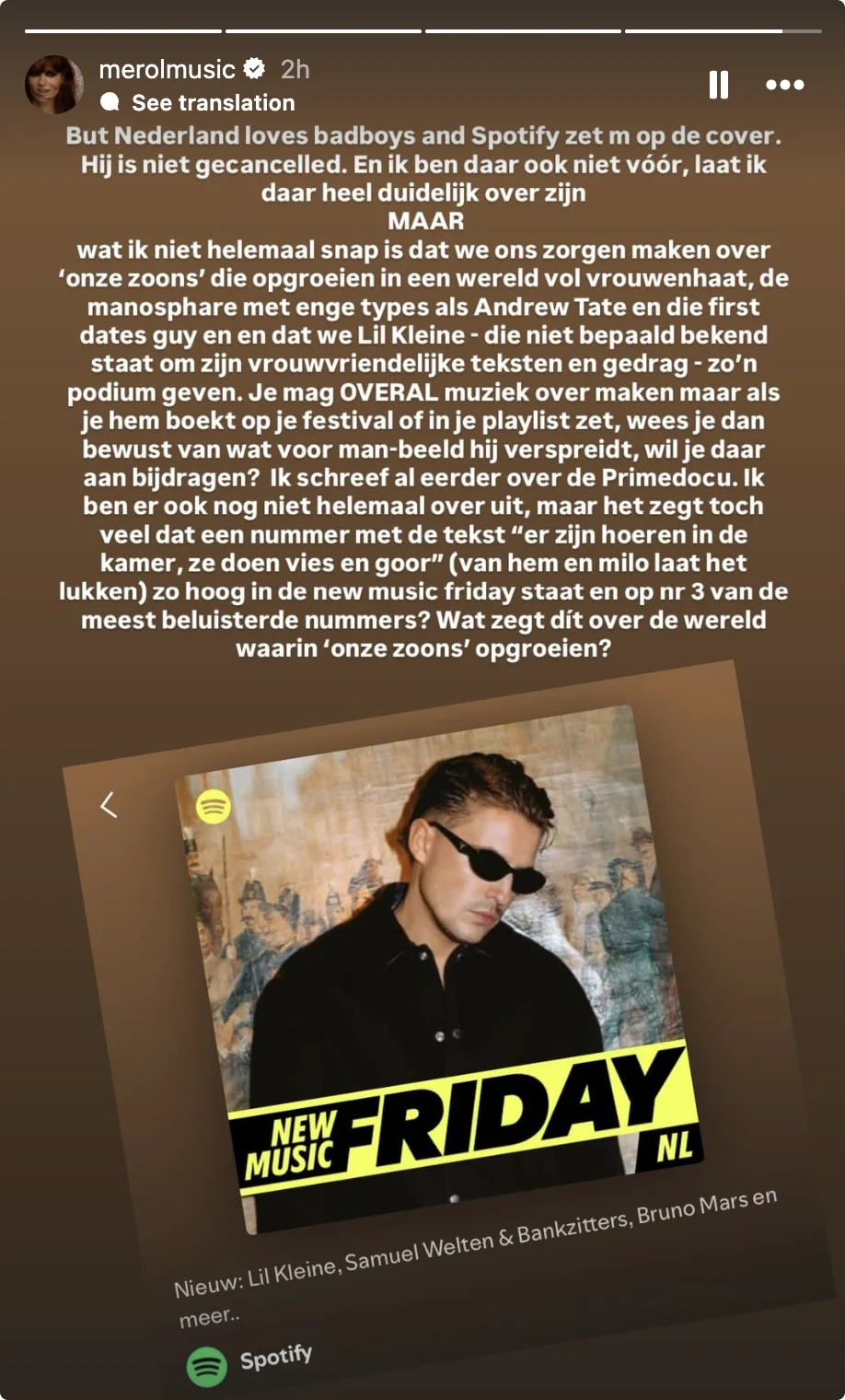 Zangeres MEROL heeft kritiek geuit op Spotify omdat rapper Lil Kleine prominent te zien is op de cover van de populaire afspeellijst New Music Friday NL. Volgens haar geeft het platform daarmee een podium aan een artiest wiens teksten vrouwonvriendelijke beelden uitdragen.