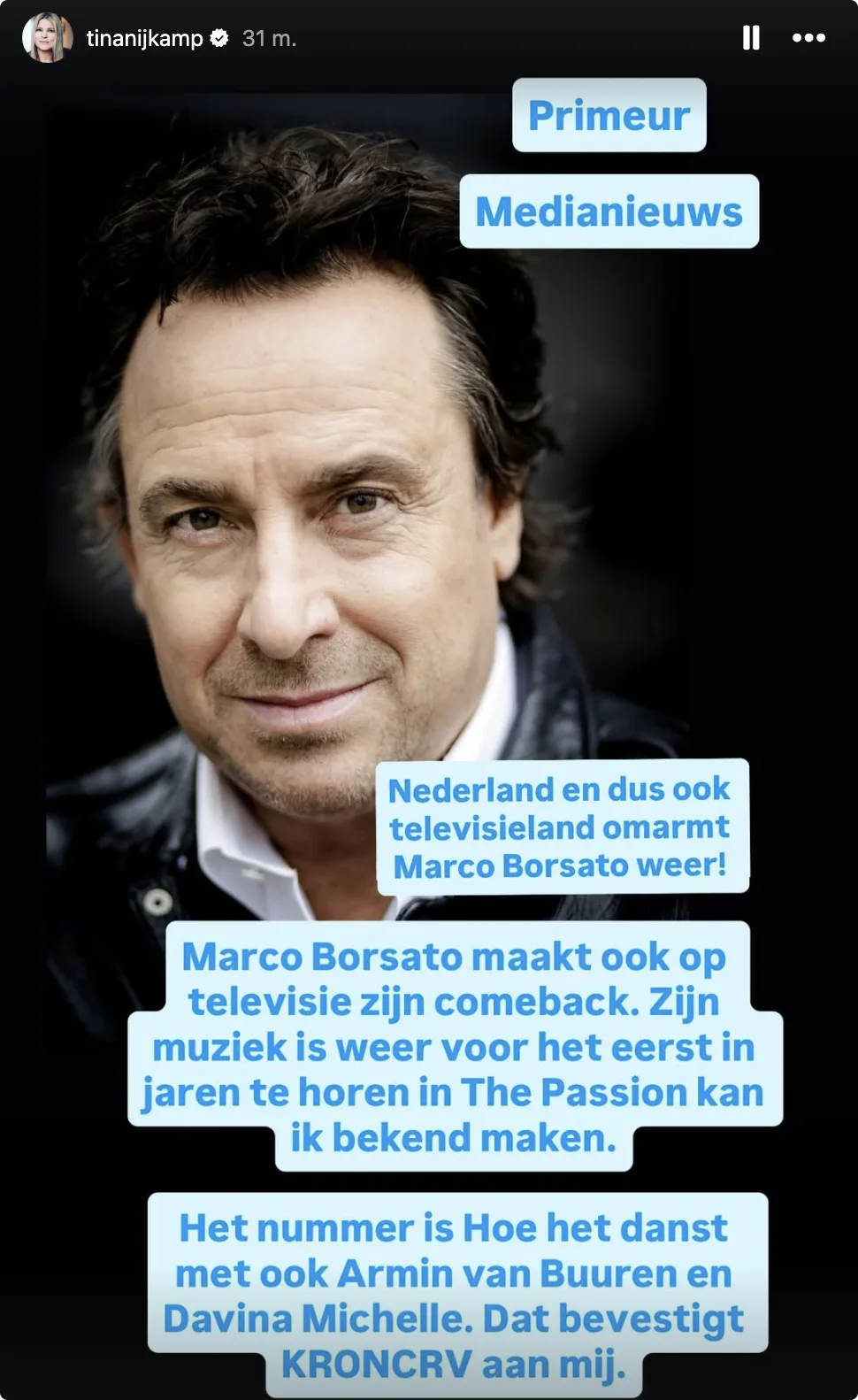 Borsato keert weliswaar nog niet fysiek terug op de buis, maar zijn muziek zal wél weer te horen zijn, weet Tina. “Medianieuws: Nederland en dus ook televisieland omarmt Marco Borsato weer! Marco Borsato maakt ook op televisie zijn comeback. Zijn muziek is weer voor het eerst in jaren te horen in The Passion, kan ik bekend maken”, schrijft ze. “In 2022 was er voor het eerst geen Borsato te horen in The Passion. Nu dus wel weer.”