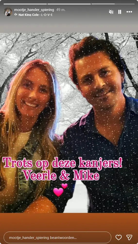 Aan Shownieuws bevestigt Monique dat Mike en Veerle 'al een hele tijd samen zijn'. Ze 'wonen al samen in Spanje' en omdat Monique het 'tijd vindt dat de het twee openbaar gingen maken', heeft ze de foto's zonder overleg online gegooid.