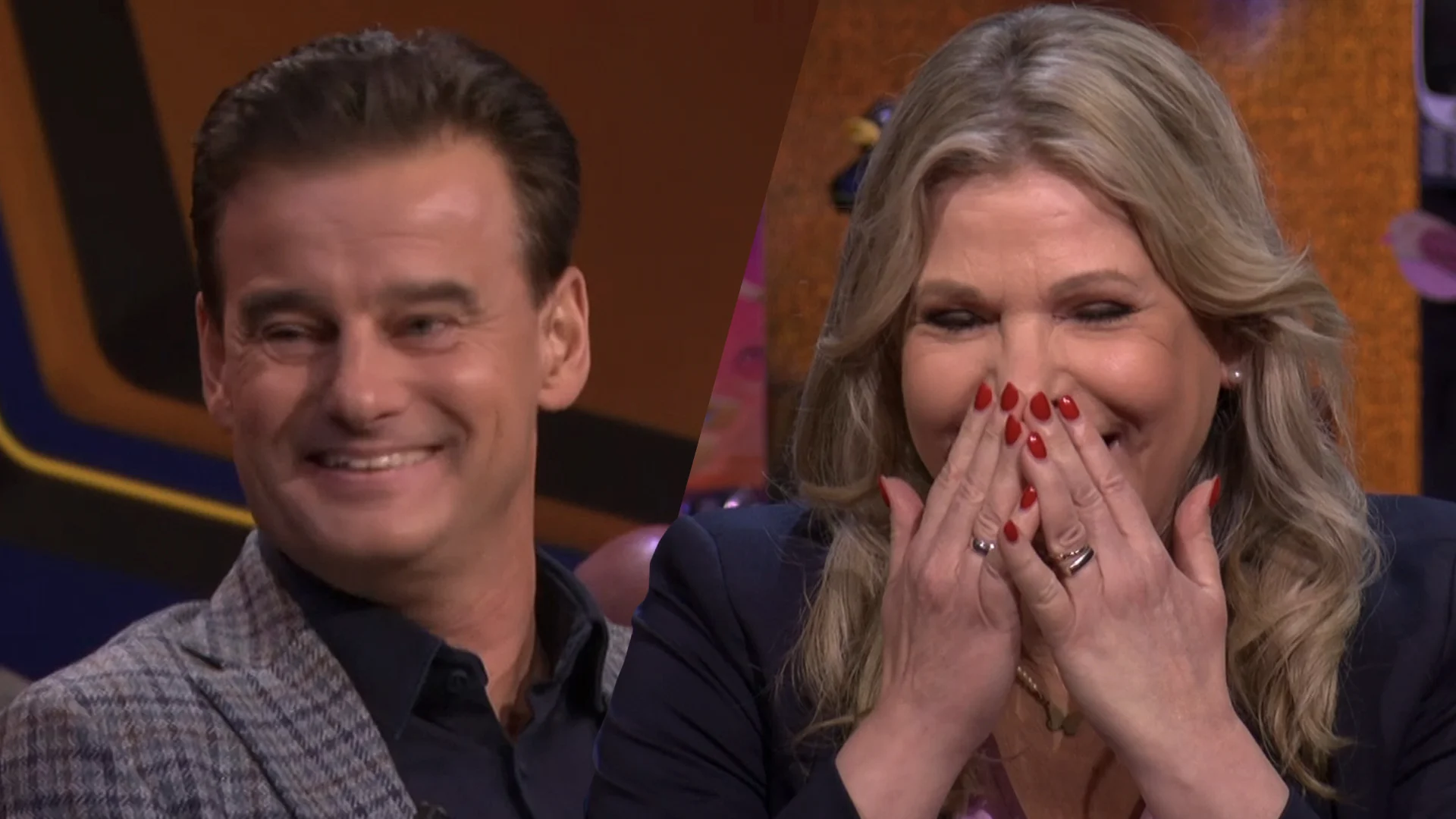 Wilfred kondigt Tina aan: "Kijk haar stralen: Tina Nijkamp", roept de presentator. "Je ziet er weer prachtig uit, Tina. Vrolijk!"