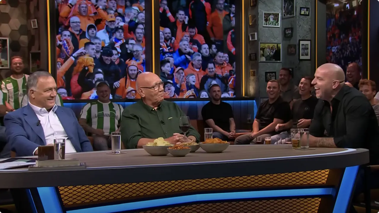 "Nee, man! Dat wordt te formeel. We moeten wel lachen! Dirk moet lekker bij de NPO gaan zitten, bij Van Hooijdonk, Van der Vaart en Ibi Afellay. Hij weet toch alles? Dan kan hij gaan uitleggen hoe ze moeten gaan spelen. Maar als trainer zijnde wist hij het niet!" (lacht)