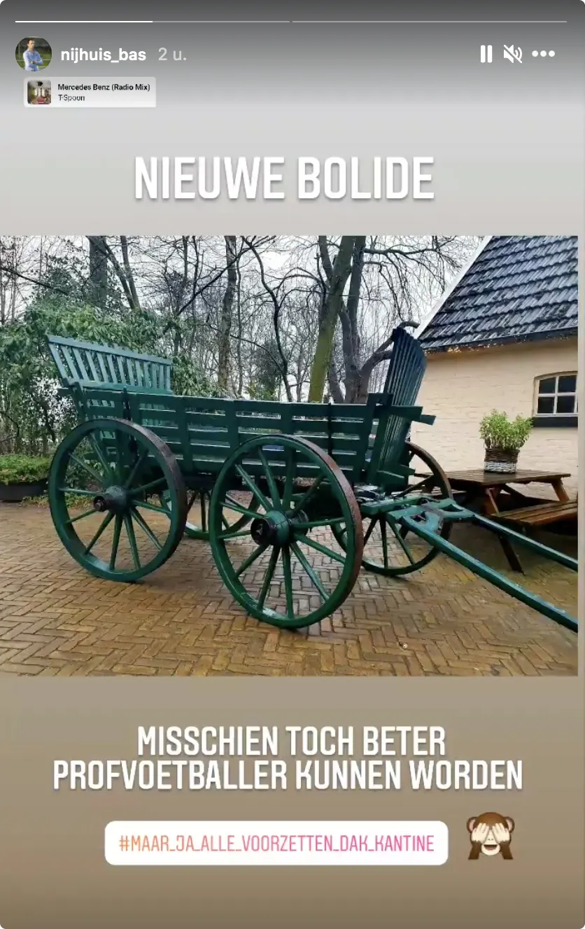 Waar veel mensen in de voetbalwereld gaan voor de nieuwste Range Rover of Mercedes, heeft Bas gekozen voor een donkergroen rijtuig die hij kan inzetten voor zijn paarden. ‘Nieuwe bolide, misschien toch beter profvoetballer kunnen worden..’, schrijft de scheidsrechter bij een foto van zijn wagen.