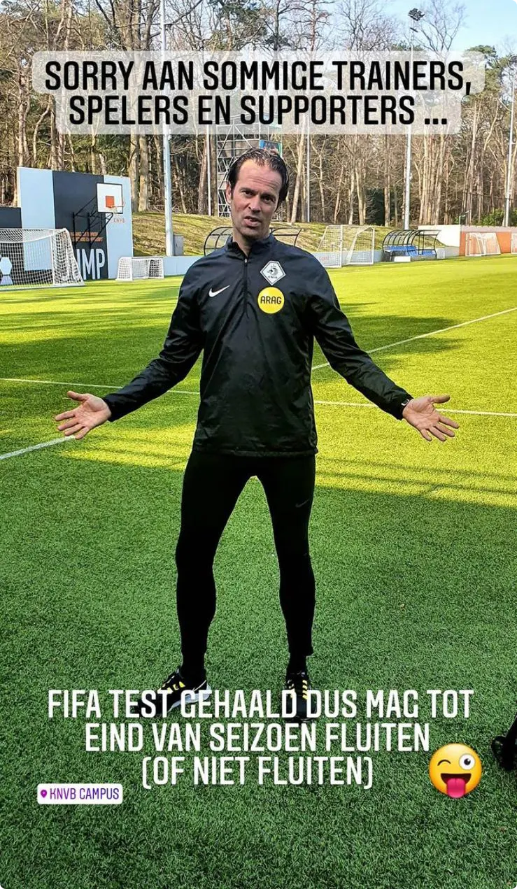 Bas biedt bij het nieuws meteen zijn excuses aan: 'Sorry aan sommige trainers, spelers en supporters… FIFA-test gehaald, dus mag tot eind van seizoen fluiten (of niet fluiten) 😜.'