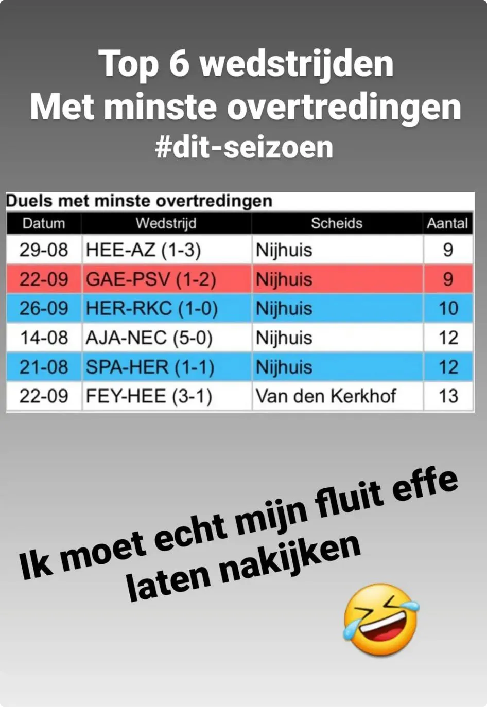 Bas Nijhuis staat bekend om zijn liberale stijl van fluiten, tot tevredenheid van velen. De scheidsrechter legt het spel dan ook niet vaak stil. Dit is ook duidelijk te zien in de statistieken van minste overtredingen per wedstrijd, aangezien hij zelf de top 5 inneemt. In 2 wedstrijden maakte hij het wel erg bont: hij gebruikte zijn fluit slechts 9 keer in een wedstrijd. Op Instagram reageert hij zelf ook het opvallende klassement.