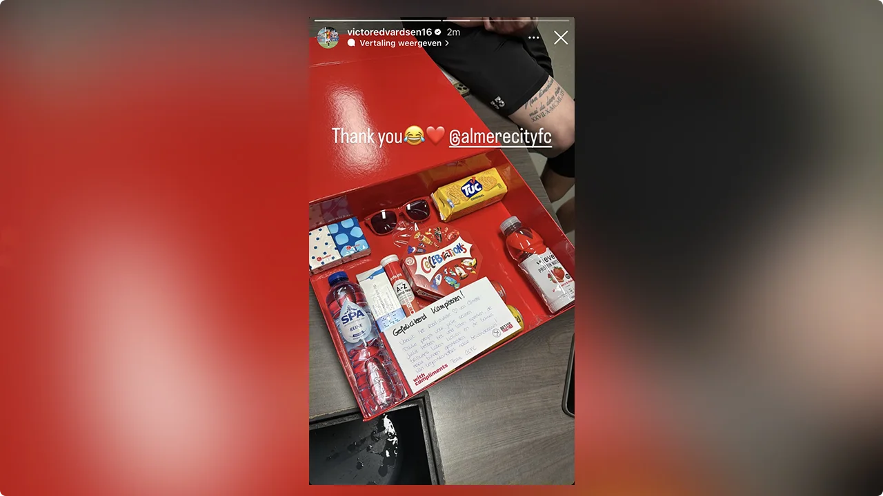 In de onderstaande foto van Go Ahead-spits Victor Edvardsen is het anti-katerpakket te zien met een knipoog naar AZ, de verliezer in de bekerfinale. De spelers uit Deventer kunnen dit zonder twijfel goed gebruiken, nadat Eagles-middenvelder Enric Llansana tijdens de huldiging in Deventer nog aangaf: "Als Almere zondag niet van ons wint, weet ik het niet meer."