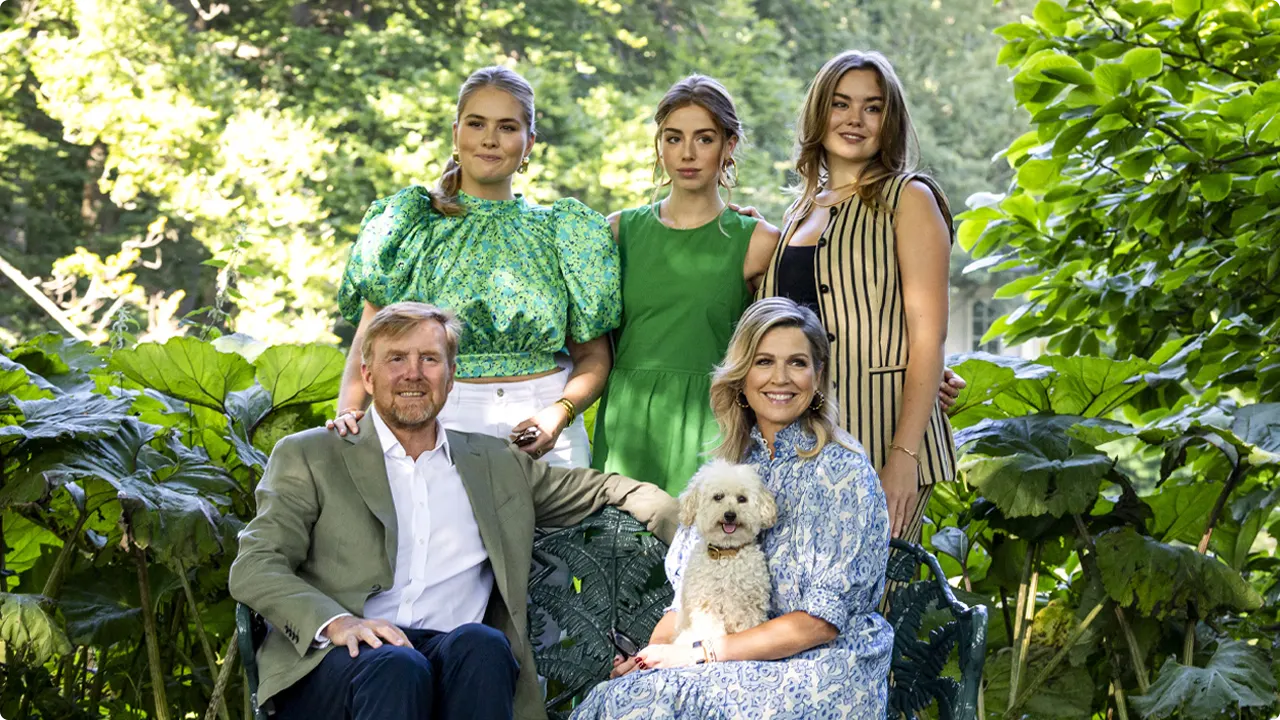 Koning Willem-Alexander, koningin Máxima en hun drie dochters hebben maandag aan het begin van de avond voor de pers geposeerd in de tuin van Paleis Huis ten Bosch. De familie koos voornamelijk voor schaduwrijke plekken onder de bomen. Ook hondje Mambo was weer bij.